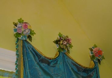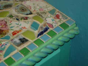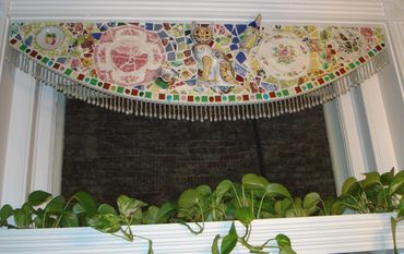 Yikes! Imagine a favorite plate jumps off the wall. That's what happened to a client who scooped up the pieces and brought them to Janice to see how it might be saved. She put the pieces back together (sort of) and created a window valance for the client's kitchen.