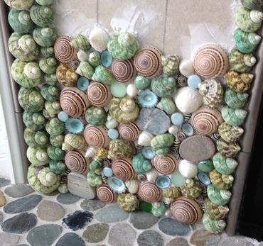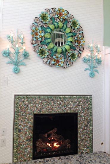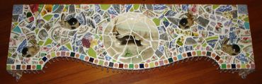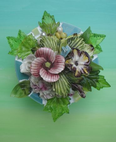 Her treasured bunny plate in the center inspired Janice to go in search of more bunnies. There are 4 bunny figurines that are attached so that the pieces are actually three dimensional. And because more-is-more, according to Janice, beaded trim graces the bottom edge - just like a fabric window treatment. No bunnies were hurt in this production. Ta da!